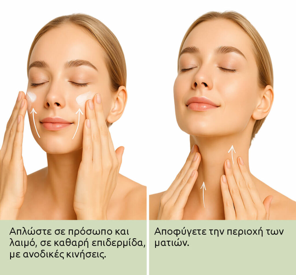 Απλώστε σε πρόσωπο και λαιμό, σε καθαρή επιδερμίδα με ανοδικές κινήσεις. Αποφύγετε την περιοχή των ματιών.